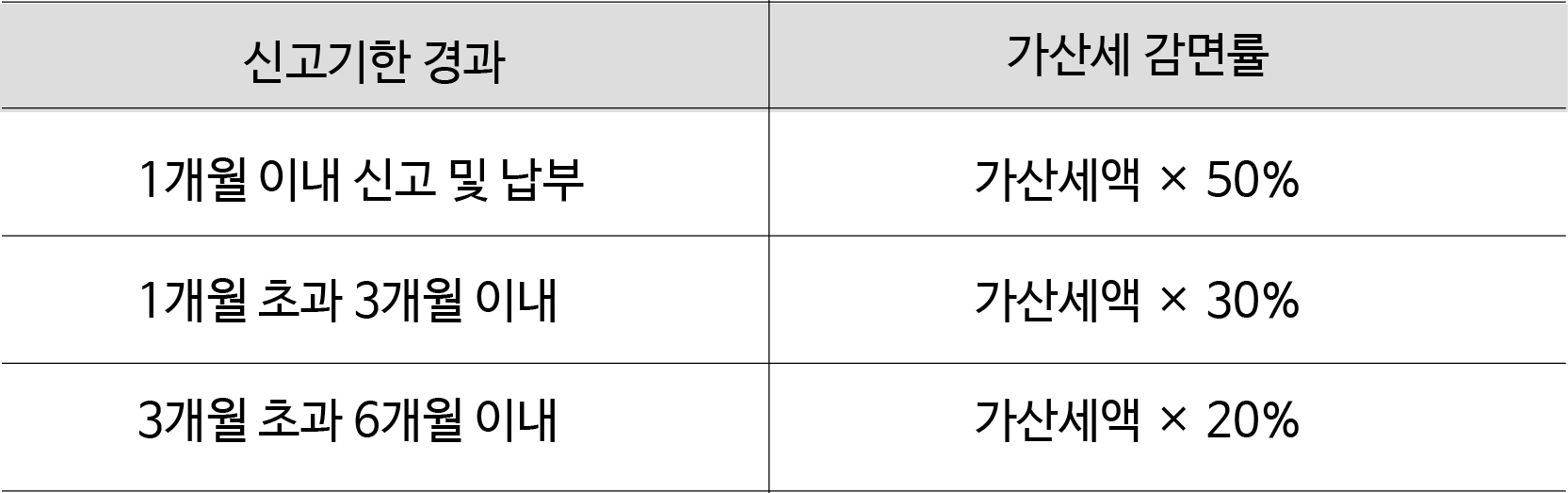 정기신고하지 않는 경우 무신고 가산세로 납부세액의 20%가 부과되지만 기한 후 신고를 6개월 이내에 하는 경우 무신고 가산세에서 최대 50% ~ 20%까지 감면을 해줍니다.